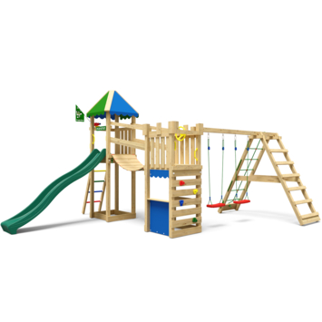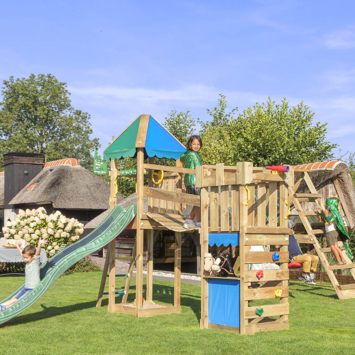 Dit is een echt buitenspeel-paradijs. Met een hangbrug, 2 schommelzitjes, klimrek met groot klimnet, speelwinkeltje, lange glijbaan, zandbak, klimwand met grote klimgrepen, trapje, telescoop en stuur. Voor kids 3-10 jaar. Jungle Gym speeltoestellen worden al 30 jaar ontworpen en geproduceerd in Nederland en staan bekend om hun topkwaliteit. Veiligheid staat altijd voorop, alle producten worden uitgebreid getest en voldoen aan de meest actuele Europese veiligheidsvoorschriften EN 71. Daarnaast zijn ze 100% compleet, aan alles is gedacht en standaard meegeleverd. De materialen zijn van hoge kwaliteit, weerbestendig, praktisch onderhoudsvrij en kindveilig zonder toxische stoffen/allergenen.