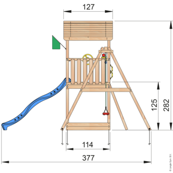 Ideaal voor peuters, kleuters en kids tot 10 jaar. Met een schommel, lange glijbaan, zandbak, trapje, telescoop en stuur. Jungle Gym speeltoestellen worden al 30 jaar ontworpen en geproduceerd in Nederland en staan bekend om hun topkwaliteit. Veiligheid staat altijd voorop, alle producten worden uitgebreid getest en voldoen aan de meest actuele Europese veiligheidsvoorschriften EN 71. Daarnaast zijn ze 100% compleet, aan alles is gedacht en standaard meegeleverd. De materialen zijn van hoge kwaliteit, weerbestendig, praktisch onderhoudsvrij en kindveilig zonder toxische stoffen/allergenen.