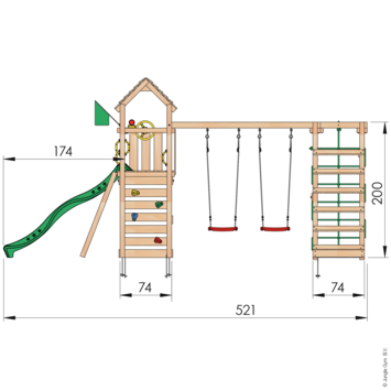 Een droom voor elk kind. Met 2 schommelzitjes, klimrek met groot klimnet, lange glijbaan, zandbak, klimwand met grote klimgrepen, trapje, telescoop en stuur. Voor kids 3-10 jaar. Jungle Gym speeltoestellen worden al 30 jaar ontworpen en geproduceerd in Nederland en staan bekend om hun topkwaliteit. Veiligheid staat altijd voorop, alle producten worden uitgebreid getest en voldoen aan de meest actuele Europese veiligheidsvoorschriften EN 71. Daarnaast zijn ze 100% compleet, aan alles is gedacht en standaard meegeleverd. De materialen zijn van hoge kwaliteit, weerbestendig, praktisch onderhoudsvrij en kindveilig zonder toxische stoffen/allergenen.