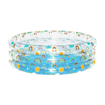 Zwembad is van matige kwaliteit en leuk en vrolijk als babybadje, want is veel kleiner dan op de verpakking staat, binnenmaat is ong. 1 meter, buitenmaat 120 cm en dus lang geen 150 cm. Voor deze prijs mag je wel meer verwachten, tip: geef 2 tientje meer uit voor een 3x zo groot bad waar je kinderen wel wat aan hebben.