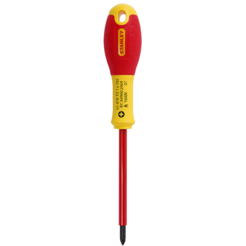 STANLEY FatMax VDE schroevendraaier Pozidriv 0-65-418 heeft een tip geschikt voor schroeven PZ1 en een kling van 100mm lengte. De zwart geoxideerde tip zorgt voor extra bescherming tegen corrosie. De kling is voozien van een polyamide beschermlaag die getest is tot 1000V (EN60900:2004). De handgreep is rechtstreeks op de kling gevormd, waardoor hij nagenoeg onbreekbaar is. De handgreep is smal van voor zodat je snel kunt schroeven en loopt breed uit zodat je ook veel kracht kunt zetten. Het handvat is voorzien van speciale anti-slip rubber waardoor je altijd maximale grip hebt.