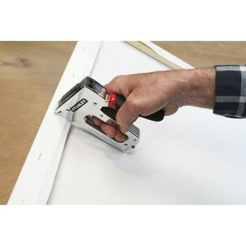 Stanley handtacker Type 6-TR120 (artikelnummer STHT6-70410) is een lichte 3-in-1 tacker met een stevige metalen behuizing voorzien van inkijkvenster. Geschikt is voor 3 verschillende types nieten/nagels: Nagels type J (10 mm), nieten type A & H (4 t/m 10 mm). Deze tacker is zeer eenvoudig en snel te laden. Is voorzien van een anti-blokkeer functie. Geschikt voor veelvuldig gebruik door ergonomische handgreep. Inclusief 500 stuks nieten type A 10 mm.