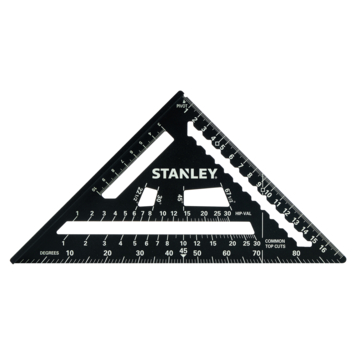 De STANLEY bouwdriehoek STHT46101-0 is een veelzijdig hulpmiddel voor al je projecten. Eén zijde heeft een extra dik profiel, waardoor hij als zaaggeleider kan dienen. Met een 90° gradenboog en schaalverdeling per graad voor het eenvoudig meten van hoeken. Standaardhoeken van dakspanten zijn gemakkelijk en snel af te tekenen. Diverse uitsparingen houden je potlood op zijn plaats, zodat je perfecte lijnen kunt trekken over de hele lengte van een plank. Met een pivoteerpunt voor gebruik als gradenboog. Door zijn afmetingen past hij gemakkelijk in je gereedschapskist. Gemaakt van aluminium. Lengte: 180 mm.