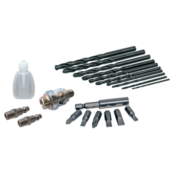 Pneumatische schroefboormachine die werkt op perslucht. Sluit de machine aan op je compressor en je kan gebruik maken van de schroef- en boorfunctie. De schroefboormachine wordt geleverd met zes verschillende bits, een olieflacon, een olietoevoeger en twee ¼" snelkoppelingen.