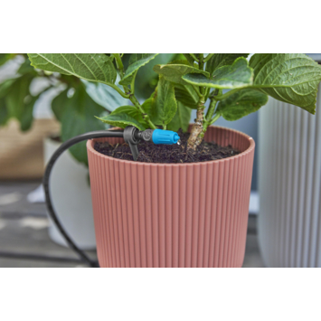 De Micro-Drip-Bewatering Terras Set van GARDENA kan gebruikt worden voor wel 30 planten en kan direct gebruikt worden. De gebruiksklare set bevat alles wat je nodig hebt voor een waterzuinige bewatering van bijvoorbeeld afzonderlijke potplanten op het terras met uiteenlopende waterbehoeften, of planten in plantenbakken. Het Micro-Drip-System is makkelijk aan te leggen: je sluit hem gewoon aan op de kraan, legt de buizen neer en plaatst de druppelaars naast de planten. Alles wordt duidelijk uitgelegd in slechts een paar stappen. De MDS-onderdelen van de set zijn herbruikbaar en daardoor is het ook erg duurzaam. Ontdek de gepatenteerde Quick & Easy-koppelingstechniek voor de 13 mm onderdelen en de unieke Easy & Flexible koppelingstechniek voor de 4,6 mm onderdelen. Het is makkelijk aan te sluiten, flexibel uit te breiden en het is ook weer simpel te ontkoppelen. De startmodule van het Micro-Drip-System is de Master Unit 1000, die de waterdruk van de pijp regelt tot ongeveer 1,5 bar en die het water gelijkmatig over de aangesloten buizen verdeelt. Dankzij de verschillende druppelaars in de set heb je daarnaast de mogelijkheid om aan de afzonderlijke waterbehoeften van je planten te voldoen. De verstelbare Endline Drip Heads zorgen voor een optimale bewatering van planten met uiteenlopende of toenemende waterbehoeften. Je kan het water verstellen tussen 0 en 15 liter per uur. Hierdoor zorg je goed voor je planten maar bespaar je toch water. Makkelijk en nauwkeurig bewateren, om water en tijd te besparen.