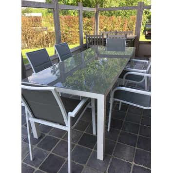De stoel Varese is een moderne tuinstoel met comfortable rug- en armleuningen, die goed past bij de tafel Toulon - ook verkrijgbaar in de webshop. De lichte maar stevige stoel is gemaakt uit aluminium in de kleur wit en waterbestendige textileen in de kleur grijs. Extra troef: stapelbaar!