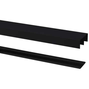Boven- en onderrail voor het maken van je rollende schuifdeuren. Deze rail van StoreMax combineer je met StoreMax deursets R-40 of R-60. Met een lengte van 240cm is deze rail geschikt voor 3 deuren. Dit type rail is ook beschikbaar in lengte 180cm (2deuren) en 360cm (4deuren) en in de kleur wit en aluminium i.p.v. zwart. Bevestig de rail met de schuine kapclip van StoreMax bij het plaatsen van deuren onder een schuin dak.