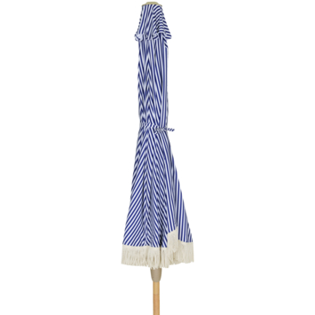 Met deze Karwei parasol creëer je een heerlijke schaduwplek op het strand of in je tuin. De diameter van 250 cm biedt genoeg ruimte voor jou en je vrienden om lekker te relaxen zonder dat je in de felle zon zit. Dankzij het handige uitklapmechanisme met hendel is het openen en sluiten van de parasol een fluitje van een cent. Het ontwerp met blauw/witte strepen en franjes geeft een vrolijke uitstraling, perfect voor een zonnige dag. De stevige constructie van metaal en stof zorgt ervoor dat deze parasol bestand is tegen de elementen. Met een hoogte van 230 cm en een breedte van 245 cm is deze parasol een echte eyecatcher. Geniet van de zomer met deze stijlvolle en functionele parasol!