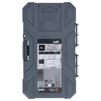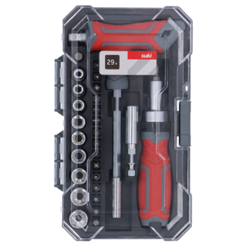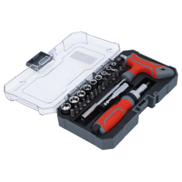 Deze 29-delige bit- en doppenset van hoogwaardig Chroom-Vanadiumstaal bevat behalve de bits en schroefdoppen ook een handige schroevendraaier met ratel, een ergonomische T-greep met bithouder en nog een magnetische bithouder. De set in de overzichtelijke cassette voorziet in de meest gebruikelijke bit- en schroefdopmaten; Bits: SL 4-5-6 mm; T 10-15-20-25-30; PH 0-1-2-3; PH 0-1-2-3; Schroefdoppen: 4-5-6-7-8-9-10-11-12 mm; 1 bit/dop-adapter.