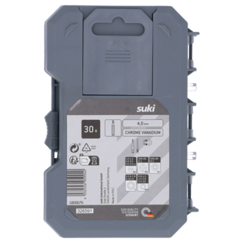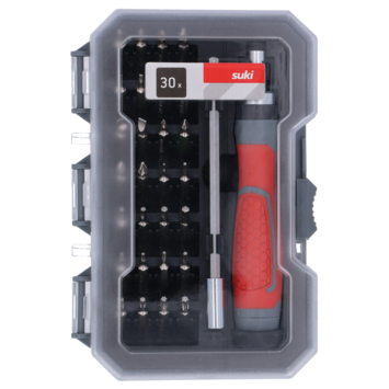 Deze 30-delige preciesie- bitset van hoogwaardig Chroom-Vanadiumstaal bevat behalve de bits ook een handige schroevendraaier met ratel met magnetische bitopname en een verlengstuk van 100mm. Deze set is bijzonder geschikt voor schroefverbindingen op elektronische componenten en apparaten en hebben een opnamemaat van 4mm. De set in de overzichtelijke cassette voorziet in de meest gebruikelijke bitmaten; SL 1,0-1,5-2,0-2,5-3,0-3,5 mm; PH 000-00-0-1; PZ 000-00-0-1; HEX 0,9-1,3-1,5-2,0-2,5-3,0; T 4-5-6-7-8-9-10-15