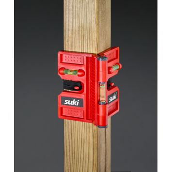 De suki-hoekwaterpas is ideaal voor het plaatsen van onder andere palen en schuttingen. De waterpas heeft een dubbele libelle waardoor de waterpas makkelijk af te lezen is, zowel horizontaal als verticaal. Palen kunnen hierdoor in twee richtingen waterpas worden gemaakt. De snoerhouders waarvan de hoekwaterpas is voorzien, zijn handig bij het uitlijnen van de maten met het suki-metselkoord. Kortom, de suki-hoekwaterpas zorgt ervoor dat je kaarsrechte schuttingen en soortgelijke bouwwerken plaatst.