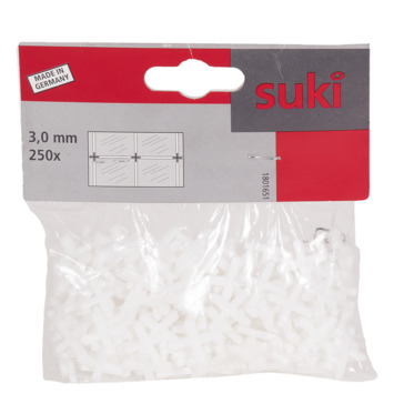 Met de Suki tegelkruisjes van 3 mm (250 stuks) kun je wand- en vloertegels eenvoudig recht en gelijkmatig plaatsen. Plaats de kruisjes tussen de tegels en zorg voor een constante voegbreedte. De verpakking van 250 stuks is geschikt voor het betegelen van grotere oppervlakken, zodat je snel en efficiënt kunt werken. Deze 3 mm tegelkruisjes zijn ideaal voor een professionele en strakke afwerking van je tegelwerk.