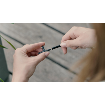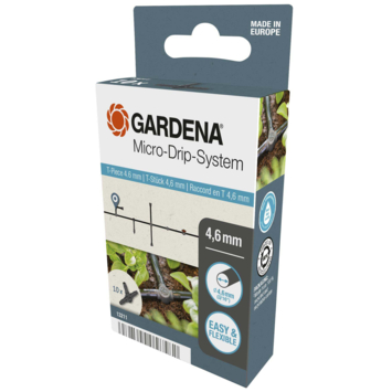Gebruik het T-stuk 4,6 mm (3/16") van GARDENA om de 4,6 mm Aanvoerbuis en 4,6 mm Druppelbuis van het Micro-Drip-System te vertakken wanneer je je plantenbed of bloembak wil bewateren. Hij helpt je ook bij een kreukvrije installatie over de randen van bloempotten of richting de potplanten. Dankzij de slimme Easy & Flexible-koppelingstechnologie kan je de Aanvoerbuizen in slechts een paar stappen handig installeren. Wanneer je het apart verkrijgbaar Hoofdapparaat 1000 (art. nr. 13333-20) of Hoofdapparaat 2000 (art. nr. 13310-20) gebruikt, is je Micro-Drip-System betrouwbaar waterdicht, met een gelijkmatige waterdruk. Dankzij zijn unieke koppelingstechnologie kan je alle onderdelen makkelijk op elkaar aansluiten, ze flexibel verlengen en ze net zo makkelijk weer ontkoppelen. Deze herbruikbaarheid maakt het Micro-Drip-System duurzaam. Het T-stuk 4,6 mm (3/16") is een GARDENA-kwaliteitsproduct, gemaakt in Europa. Micro-Drip-System. Zo zorg je goed voor je planten maar bespaar je toch water. Makkelijk en nauwkeurig bewateren, om water en tijd te besparen.
