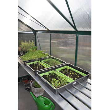 De blanke aluminium Alu Grower 150 vormt een universele kweektafel. Deze tafel heeft een vaste breedtemaat van 62,5 cm en een lengte van 150 cm. De constructie bestaat uit aluminium leggers (6 stuks), dragers en schoren (4 stuks). Een solide verbinding met het kasframe wordt gemaakt met behulp van RVS (hamerkop)bouten en moeren, standaardmaat M6. De kweektafel is in hoogte verstelbaar en kan op een ideale werkhoogte worden ingesteld. De Alu Grower 150 vormt een solide eenheid met de kas en helpt de kweekruimte optimaal te benutten. Deze tafel wordt over 2 staande glasroeden (kasframe) bevestigd en steekt daarmee zowel aan de linker- als rechterzijde voorbij de roede. De gevel- of lengtezijde dient daarom minimaal 3 ruiten breed of lang te zijn.