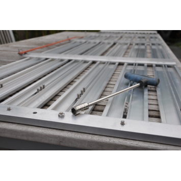 Deze blanke aluminium Alu Grower 200 vormt een universele kweektafel en is leverbaar in diverse maatvoeringen. Deze tafel heeft een vaste breedtemaat van 62,5 cm en een lengte van 200 cm. De constructie bestaat uit aluminium leggers (6 stuks), dragers en schoren (5 stuks). Een solide verbinding met het kasframe wordt gemaakt met behulp van RVS (hamerkop)bouten en moeren, standaardmaat M6. De kweektafel is in hoogte verstelbaar en kan op een ideale werkhoogte worden ingesteld. De Alu Grower 200 vormt een solide eenheid met de kas en helpt de kweekruimte optimaal te benutten. Deze tafel wordt over 3 staande glasroeden (kasframe) bevestigd en steekt daarmee zowel aan de linker- als rechterzijde voorbij de roede. De gevel- of lengtezijde dient daarom minimaal 4 ruiten breed of lang te zijn.