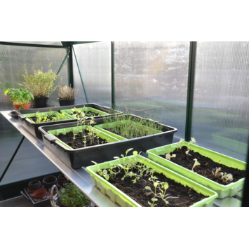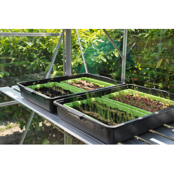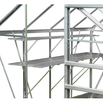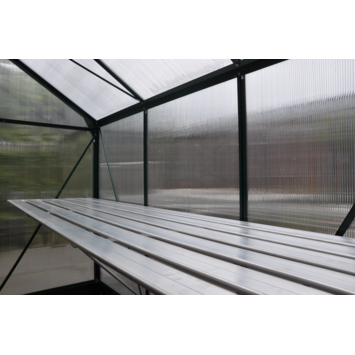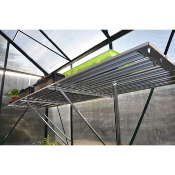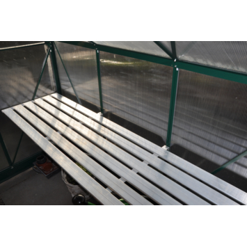 Deze blanke aluminium Alu Grower 250 vormt een universele kweektafel en is leverbaar in diverse maatvoeringen. Deze tafel heeft een vaste breedtemaat van 62,5 cm en een lengte van 250 cm. De constructie bestaat uit aluminium leggers (6 stuks), dragers en schoren (6 stuks). Een solide verbinding met het serreframe wordt gemaakt met behulp van RVS (hamerkop)bouten en moeren, standaardmaat M6. De kweektafel is in hoogte verstelbaar en kan op een ideale werkhoogte worden ingesteld. De Alu Grower 250 vormt een solide eenheid met de kas en helpt de kweekruimte optimaal te benutten. Deze tafel wordt over 4 staande glasroeden (kasframe) bevestigd en steekt daarmee zowel aan de linker- als rechterzijde voorbij de roede. De gevel- of lengtezijde dient daarom minimaal 5 ruiten breed of lang te zijn.
