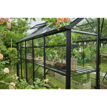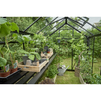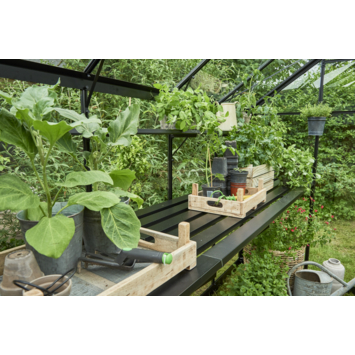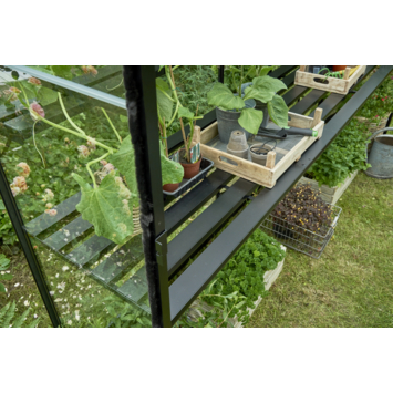 Deze zwarte geïntegreerde aluminium kweektafel is precies passend leverbaar voor de Birdlip 48. De lengte van de tafel is gelijk aan de binnenmaat van de langste zijde van de tuinserre. De hoogte is instelbaar is voor een optimale werkhouding, dus zaaien en kweken op stahoogte! De tafel heeft een breedte van 40 cm breed.