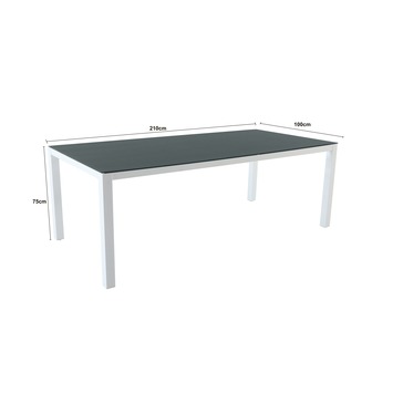 De tafel Cannes is gemaakt uit aluminium in de kleur wit, waardoor hij tegelijkertijd licht, stevig en elegant is. De tafel is 210 centimeter lang, 100 centimeter breed en 75 centimeter hoog waardoor je met gemak kan tafelen met 6 tot 8 personen. Extra troef: het tafelblad is bekleed met veiligheidsglas, waardoor het tegen meer dan één stootje kan. Tip: een aluminium tafel kan tegen weer en wind. Al bescherm je 'm in de winter best tegen barre weersomstandigheden, zodat de tafel (nog) langer mooi blijft.