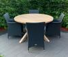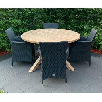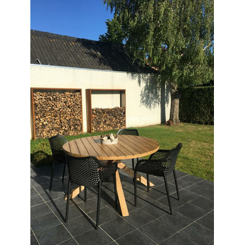 Eettafel Elzas is een leuke ronde tafel voor in de tuin. De tafel heeft een diameter van 140 cm, is gemaakt van acaciahout en is reeds voorzien van een eerste laag tuinmeubelolie waardoor je tafel langer meegaat. Hout dat echter langdurig in de zon en regen staat, kan na verloop van tijd verkleuren. Behandel je tafel daarom regelmatig (1 à 2x per jaar) opnieuw met olie en berg ze na het tuinseizoen op.