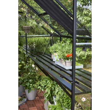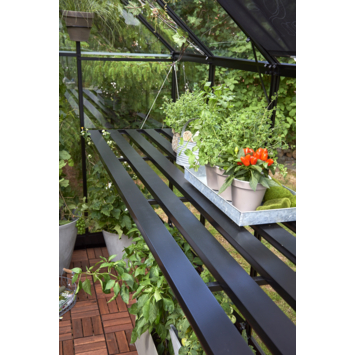 Deze zwarte geïntegreerde aluminium kweektafel is precies passend voor de tuinkas Qube 66. De lengte van de tafel is gelijk aan de binnenmaat van de zijgevel van de kas en is voorzien van dezelfde zwarte coating als de tuinserre. De hoogte is instelbaar voor een optimale werkhouding.
