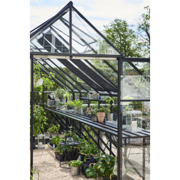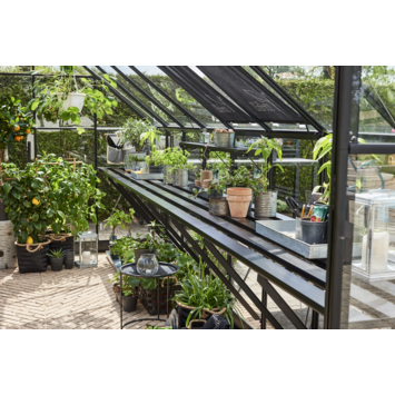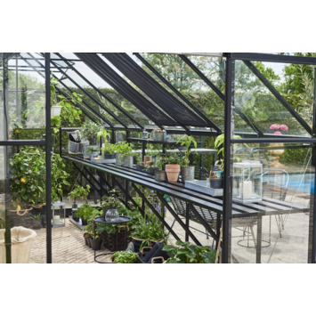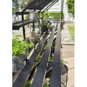 Deze zwarte geïntegreerde aluminium kweektafel is precies passend voor de tuinkas Qube 816. De lengte van de tafel is gelijk aan de binnenmaat van de zijgevel van de kas en is voorzien van dezelfde zwarte coating als de tuinserre. De hoogte is instelbaar voor een optimale werkhouding.