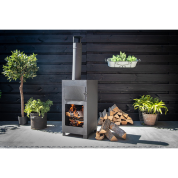 Met deze zwarte terraskachel met ingebouwde pizzaoven bak je de lekkerste pizza’s gewoon in je eigen tuin. De houtgestookte oven zorgt voor die authentieke Italiaanse smaak, compleet met krokante bodem. De kachel is gemaakt van dik staal en voorzien van een robuste coating. Zo heb je er lang plezier van. Naast het bakken zorgt de kachel ook voor warmte en sfeer tijdens frisse avonden. Een echte blikvanger met een moderne uitstraling, perfect voor gezellige avonden buiten.
