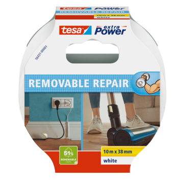 De Tesa Extra Power Eco Repair tape wit 38 mm x 10 m is een klustape die je zowel binnen als buiten kan gebruiken en die geschikt is voor gladde en oneffen ondergronden. De tape is gemaakt van textiel met een PET-basis waardoor hij extra sterk en scheurbestendig is maar toch gemakkelijk met de hand afgescheurd kan worden. Omdat de tape UV-bestendig is, blijft hij ook buitenshuis goed kleven. De tape is oplosmiddelvrij, voor 64% vervaardigd uit hernieuwbare grondstoffen en voorzien van een kleeflaag op basis van natuurlijk rubber. De verpakking bestaat voor 80% uit gerecycled karton en de tape is beschrijfbaar waardoor je hem ook kan gebruiken om voorwerpen te markeren of voor knutselwerk.