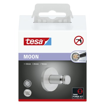 De tesa® Moon handdoekhaak biedt een eenvoudige en nette manier om handdoeken op te hangen. De haak heeft een roestvrijstalen afwerking met een anti-vingerafdruk behandeling, waardoor hij zijn strakke look behoudt zonder dat je hem vaak hoeft schoon te maken. Met de tesa® Power.Kit technologie bevestig je de haak snel zonder boren. Plak de adapter op de muur, vul deze met de meegeleverde lijm en laat het 12 uur uitharden. Daarna schroef je de haak vast op de adapter. De set bevat alles wat je nodig hebt. Deze haak werkt goed op tegels, metaal, natuursteen en glas. Behang en stucwerk zijn minder geschikt. Verwijderen kan zonder lijmresten. De haak past gemakkelijk in elke badkamer.