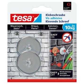 Tesa klevende schroef steen en baksteen rond 10 kg 2 stuks voor betrouwbare hechting op ruwe en harde oppervlakken, binnen en buiten, en een draagkracht tot 10 kg per schroef. Het aantrekkelijke design maakt deze schroeven ideaal voor voorwerpen met een zichtbare bevestiging. Tesa klevende schroef steen en baksteen rond 10 kg 2 stuks zijn eenvoudig te monteren zonder gereedschap. Alles wat je nodig hebt, zit in de verpakking. Plaats de schroef, breng het hechtmiddel aan, laat het 12 uur uitharden en hang je waterslanghouder of gereedschapsrekje op. Je kunt meerdere schroeven gebruiken om zwaardere voorwerpen te monteren én ze zijn verwijderbaar.