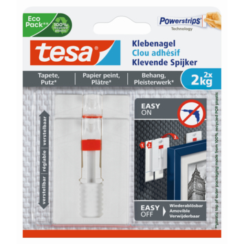 Tesa verstelbare klevende spijkers behang en pleisterwerk 2 kg 2 stuks en de meegeleverde klevende strips zorgen voor betrouwbare hechting op oneffen en gevoelige oppervlakken en hebben een draagkracht van max. 2 kg per spijker. De verstelbaarheid in hoogte maakt ze geschikt voor verticale uitlijning van lijsten. De powerstrips technologie zorgt dat de spijker kan worden verwijderd. Er blijft niets achter behalve een schoon en onbeschadigd oppervlak. De Tesa verstelbare klevende spijkers behang en pleisterwerk 2 kg 2 stuks kan opnieuw worden gebruikt met een nieuwe tesa klevende strip. Eenvoudige montage zonder hamers en boren.