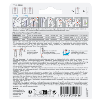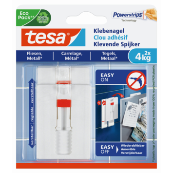 Tesa verstelbare klevende spijkers tegels en metaal 4kg 2 stuks en de meegeleverde klevende strips hebben een draagkracht tot 4 kg per spijker. Ze bieden betrouwbare hechting op gladde en harde oppervlakken. De verstelbaarheid in hoogte maakt ze geschikt voor verticale uitlijning van voorwerpen of het gebruik van twee klevende spijkers voor één voorwerp. Eenvoudig te monteren zonder schade aan oppervlakken en zonder gedoe met hamers of boren. Dankzij de powerstrips technologie kan de spijker worden verwijderd zonder sporen na te laten. Tesa verstelbare klevende spijkers tegels en metaal 4kg 2 stuks zijn herbruikbaar met een nieuwe tesa klevende strip.