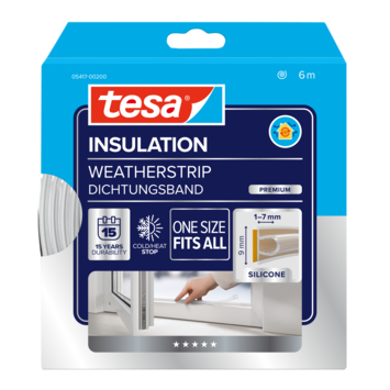 Geef tocht geen kans: je kan de afstand tussen het raam en de muur gemakkelijk afdichten met een zelfklevende strip. Zo bespaar je niet alleen verwarmingskosten, maar ben je ook beschermd tegen stof en lawaai. Maak je keuze uit verschillende Tesa Moll producten, zoals dit Super-Flex siliconenprofiel dat uitblinkt in kleefkracht, flexibiliteit en transparantie. Ideaal om extreme weersomstandigheden op een afstand te houden. One size fits all.