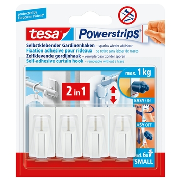 De Powerstrips van tesa zijn zelfklevende producten die je zo weer kan verwijderen zonder sporen na te laten. Ze zijn klein, maar hebben een grote daadkracht. Maak je keuze uit verschillende items met verschillende doeleinden zoals deze witte gordijnhaken (3 stuks).