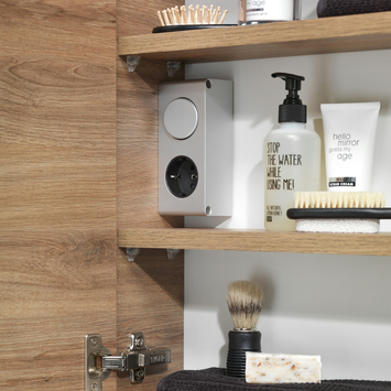 Handige opbouw unit met stopcontact en schakelaar voor de spiegelverlichting. Stopcontact voor elektronische apparaten. Mooi te integreren in diverse spiegelkasten van Tiger.