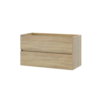 Compact en warm. Dit compacte meubel van 100 cm in licht eiken afwerking brengt een natuurlijke sfeer in je badkamer.Perfect voor kleinere ruimtes, met twee greeploze soft-close lades.De houten lades zijn volledig uittrekbaar, waardoor je altijd overzicht hebt en eenvoudig overal bij kunt. Duurzaam geproduceerd en ontworpen voor dagelijks gemak. Combineer met de bijpassende kolomkast voor een complete look.