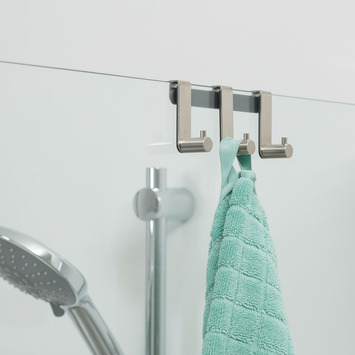 Het Tiger haakrek t.b.v. douchewand Rhino 6-8 mm inox gebruik je als handig ophangrekje aan je douchewand of glazen douchedeur met een dikte van 6-8 mm. Als deze geen profiel hebben: het rekje met haken is aan de binnenzijde voorzien van een zacht, beschermend materiaal, zodat het glaspaneel niet beschadigt. Het rekje heeft 3 haken waaraan je makkelijk een washandje, een handdoek of andere items aan ophangt. Je kunt het haakje zowel in als buiten de douchecabine ophangen, want het is gemaakt van geborsteld inox. Het is dus goed bestand tegen vocht. Met afmetingen van 160 mm breed, 61 mm hoog en 37 mm diep past deze moderne douchecabinehaak in vrijwel iedere badkamer.