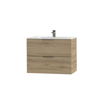 Door het strakke en tijdloze design past dit Tiger badkamermeubel Studio in iedere badkamer. Deze wastafelonderkast heeft 2 ruime lades om alle badkamerspullen overzichtelijk in op te bergen. De lades zijn uitgerust met hoogwaardige 'soft close' geleiders waardoor ze geruisloos sluiten. De warme houttint geeft een sfeervol karakter aan het meubel. Daarnaast krijgt het meubel, door de voelbare houtnerf, een mooie natuurlijke uitstraling. De mooie, wit glanzende polybeton wastafel met ovale waskom en rvs grepen maken deze set compleet.