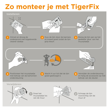 Met TigerFix zijn Tiger accessoires snel en eenvoudig op een gladde, harde ondergrond te bevestigen door middel van een gepatenteerd lijmsysteem. Je badkamer verfraaien met Tiger accessoires was nog nooit zo eenvoudig. Na het mixen van de lijm kan deze eenvoudig op het muurplaatje worden aangebracht en na 4 uur kun je het accessoire plaatsen. Zo simpel is het! Wil je geen gaten boren in je nieuwe badkamertegels, zeker niet in natuursteen of grote tegels? Dan is TigerFix de oplossing. Deze gepatenteerde manier van monteren garandeert een zeer krachtige lijmverbinding op iedere gladde, stevige ondergrond. Groot voordeel van TigerFix is dat het muurplaatje eenvoudig, zonder beschadigingen, te verwijderen is. Handig bij huurwoningen, verhuizen of gewoon wanneer je accessoires wilt verplaatsen. TigerFix is geschikt voor nagenoeg alle accessoires uit de Tiger series en kun je herkennen aan het Tigerfix symbool op de verpakking.