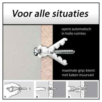 De kunststof Toggler-alligatorplug AF6 heeft een diameter van 6mm en koop je per 6 stuks. Je gebruiktde alligatorplug met kraag voor het stevig bevestigen van voorwerpen in beton, gasbeton, gipsblokken, kalkzandsteen en baksteen. De Toggler-plug heeft een boormaat van 6mm en wanneer je in de tegel boort een maat van 8mm. De 6mm-plug is maximaal te belasten met 288kg, afhankelijk van het materiaal. Deze supersterke montage heeft de alligatorplug AF6 te danken aan zijn speciale vorm. Naast het feit dat de alligatorplug erg krachtig is, is de plug ook ideaal om te gebruiken voor bijvoorbeeld materialen met een stuclaag of te grote boorgaten. De alligatorplug van Toggler draait namelijk niet met de schroef mee dankzij de anti-rotatievleugels. Zelfs als het boorgat te groot is, schroef je de schroef probleemloos in de plug en zorg je voor een stevige bevestiging. De schroefmaat is 35mm tot maximaal 50mm, met een minimale lengte van 35mm plus de materiaaldikte. Met de 6mm alligatorplug hang je bijvoorbeeld keukenkasten en badkamermeubels op, zoals douchedeuren, maar ook keukenkasten en flatscreens. De verpakking bevat 6 alligatorpluggen AF6 van Toggler.