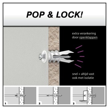 De Toggler-gipsplaatplug SPM-20, 20 stuks, is geschikt voor montage in gipsplaat van 9,5mm, 12,5mm of 15mm dikte. De mini-gipsplaatplug monteert u snel en eenvoudig, omdat deze zelfborend en zelfborgend is. Voorboren is dus niet nodig. U gebruikt een schroef van 3,5mm bij 4mm dikte en een minimale lengte van 25mm plus de materiaaldikte. Voor montage van deze schroef gebruikt u een schroevendraaier of hetzelfde bitje als u voor montage van de SPM-plug gebruikt. Zodra de gipsplaatplug in de wand is geplaatst, klapt deze open achter de gipsplaat. Dit zorgt voor een extra stevige bevestiging van verschillende voorwerpen met een maximaal gewicht van 120kg, afhankelijk van het materiaal waarin u monteert. Denk aan schilderijen, spiegels of flatscreens. Deze verpakking bevat in totaal 20 SP-mini-gipsplaatpluggen van Toggler.