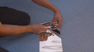 Sterke folie die goed in de lengte aangebracht kan worden. Het beste met stukjes tape omdat aanbrengen met dubbelzijdig tape erg lastig is.