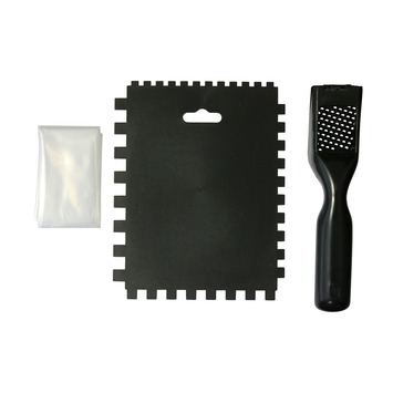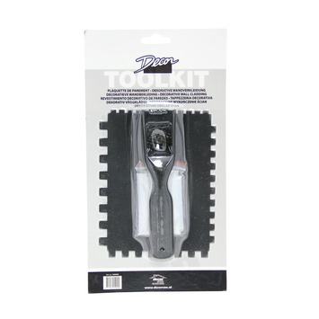 De Decor Toolkit is het ideale hulpmiddel voor het verwerken van siersteenstrips zodat de natuurlijke schoonheid en uitstraling van deze decoratieve wandbekleding optimaal naar voren komt. Dit pakket bestaat uit een rasp voor het afschaven dan wel schuren van de achterkant van de siersteenstrips, een lijmkam voor het aanbrengen van de lijm en een spuitzak, waarmee de voeg gemakkelijk in het geheel verwerkt kan worden.