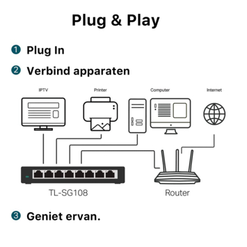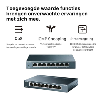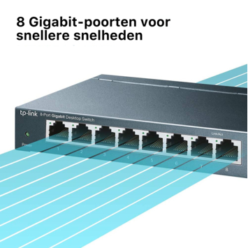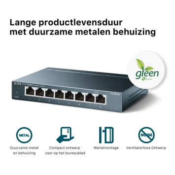De TL-SG108 10/100/1000 Mbps Desktop switch met 8 aansluitingen van TP-LINK biedt een eenvoudige manier om de overstap naar gigabit ethernet te maken. Je kunt de snelheid van je netwerkserver en backbone verbindingen verhogen, of van gigabit op je desktop een realiteit maken. De TL-SG108 heeft bovendien een laag energieverbruik. Dankzij zijn innovatieve energiebesparende techniek kan met de TL-SG108 tot 72% op het stroomverbruik worden bespaard, waardoor hij een milieuvriendelijke oplossing voor je bedrijfsnetwerk is.