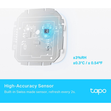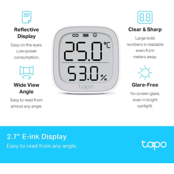 De Tapo T315 biedt realtime, nauwkeurige metingen van zowel temperatuur als luchtvochtigheid met een meetnauwkeurigheid van ± 0,54 °C en ± 3% RH. Het 2,7" e-ink-display toont niet alleen de gemeten waarden, maar ook het comfortniveau met behulp van smileys, batterijstatus en signaalsterkte. Je kunt huishoudelijke apparaten zoals verwarming, airconditioning of luchtbevochtigers automatisch aansteken of uitschakelen, waardoor je het binnenklimaat optimaliseert en tegelijkertijd energie bespaart. De app stuurt meldingen wanneer de waarden buiten het ingestelde bereik vallen. Bovendien worden de meetgegevens gratis opgeslagen en kunnen ze worden weergegeven in grafieken voor eenvoudig overzicht van de temperatuur- en luchtvochtigheidsniveaus. De Tapo T315 kan zowel op een bureau als aan de muur worden geïnstalleerd. Voor slimme functies zoals externe monitoring en huisautomatisering is de Tapo-hub vereist.