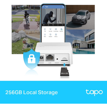 De Tapo H200 Smart Hub is het hart van je Tapo Smart Home. Hiermee kun je beelden van Tapo-camera's of Tapo-videodeurbellen direct opslaan op een microSD-kaart (maximaal 512 GB, niet inbegrepen). De hub kan tot 64+4 apparaten verbinden, waaronder tot 64 schakelaars, sensoren of knoppen en 4 camera's of deurbellen, zodat je een smart-ecosysteem kunt opbouwen. Het werkt met verschillende Tapo-producten, zoals de Tapo C420, Tapo C400 en Tapo D230.