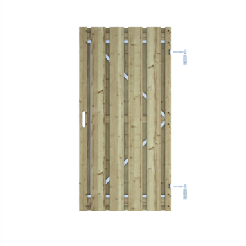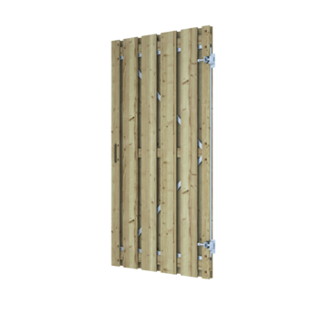 De Royal tuindeur is ideaal om de tuin af te scheiden waarachter je heerlijk kunt ontspannen, genieten van de natuur en kostbare momenten kunt doorbrengen met dierbaren. De tuindeur is 180 cm hoog, 100 cm breed en 5,1 cm diep. De tuindeur bestaat uit 11 verticale planken die op een stalen frame zijn vastgemaakt. De deur is tweezijdig en kan zowel links- als rechtsdraaiend gemonteerd worden. De tuindeur heeft enige doorkijk en wordt inclusief hengen, zonder sluitwerk en zonder duimen geleverd. De tuindeur is gemaakt van geïmpregneerd grenen hout dat een vleugje rustieke charme toevoegt aan de tuin. Het impregneren van het hout zorgt ervoor dat de levensduur verlengd wordt tot 10-15 jaar en dat het hout resistent wordt tegen (oppervlakte) schimmels.
