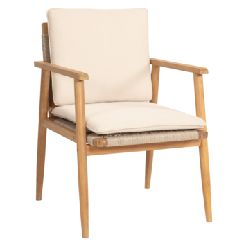 Deze tuinstoel Fenna brengt een elegante en natuurlijke look in je tuin. Met z’n lichte teak kleur, comfortabele afmetingen (40 cm zithoogte, 59 cm breed en 68 cm diep) en bijpassende kussens zit je altijd goed. De beige geweven zitting ziet er luxe uit, is weerbestendig en vraagt weinig onderhoud. Het stevige acaciahouten onderstel met teakbeits geeft de stoel een stoere en warme uitstraling, perfect voor elke buitenruimte. De stoel wordt geleverd met een comfortabel zit- en rugkussen in bijpassend beige, zodat je meteen kunt relaxen. Je krijgt de stoel als bouwpakket, maar de montage is eenvoudig dankzij de duidelijke handleiding. Zo kun je snel genieten van je nieuwe tuinstoel.