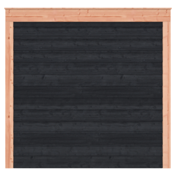 De wanden zijn afgewerkt met zwart Zweeds rabat en de constructie bestaat uit onbehandeld Douglas hout met stevige staanders van 12 x 12 cm. Het platte dak zorgt voor een strakke en praktische afwerking.