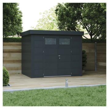 Het tuinhuis Eleganto van Aquaplan is een elegant metalen tuinhuis in de kleur antraciet. Het tuinhuis is verkrijgbaar in maar liefst 9 verschillende afmetingen, waaronder dit rechthoekige tuinhuis met aflopend dak van 2,7 op 2,4 meter groot. Het tuinhuis Eleganto beschikt over een dubbele deur met 2 ramen en is uitzonderlijk goed afgewerkt met onder andere een veilig cilinderslot en een geïntegreerde dakgoot. Het voordeel van een metalen tuinhuis? Makkelijk in elkaar te zetten (én uit elkaar te halen om elders weer in elkaar te zetten), ongelooflijk onderhoudsvriendelijk, stevig, duurzaam en mooi om te zien. Ook verkrijgbaar in de kleur wit.