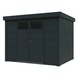 Het tuinhuis Eleganto van Aquaplan is een elegant metalen tuinhuis in de kleur antraciet. Het tuinhuis is verkrijgbaar in maar liefst 9 verschillende afmetingen, waaronder dit rechthoekige tuinhuis met aflopend dak van 3 op 2,4 meter groot. Het tuinhuis Eleganto beschikt over een dubbele deur met 2 ramen en is uitzonderlijk goed afgewerkt met onder andere een veilig cilinderslot en een geïntegreerde dakgoot. Het voordeel van een metalen tuinhuis? Makkelijk in elkaar te zetten (én uit elkaar te halen om elders weer in elkaar te zetten), ongelooflijk onderhoudsvriendelijk, stevig, duurzaam en mooi om te zien. Ook verkrijgbaar in de kleur wit.
